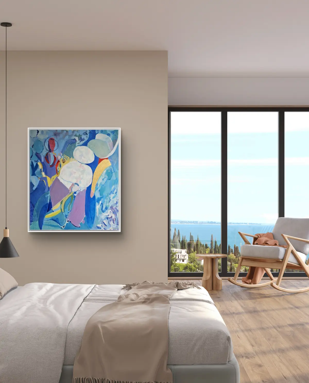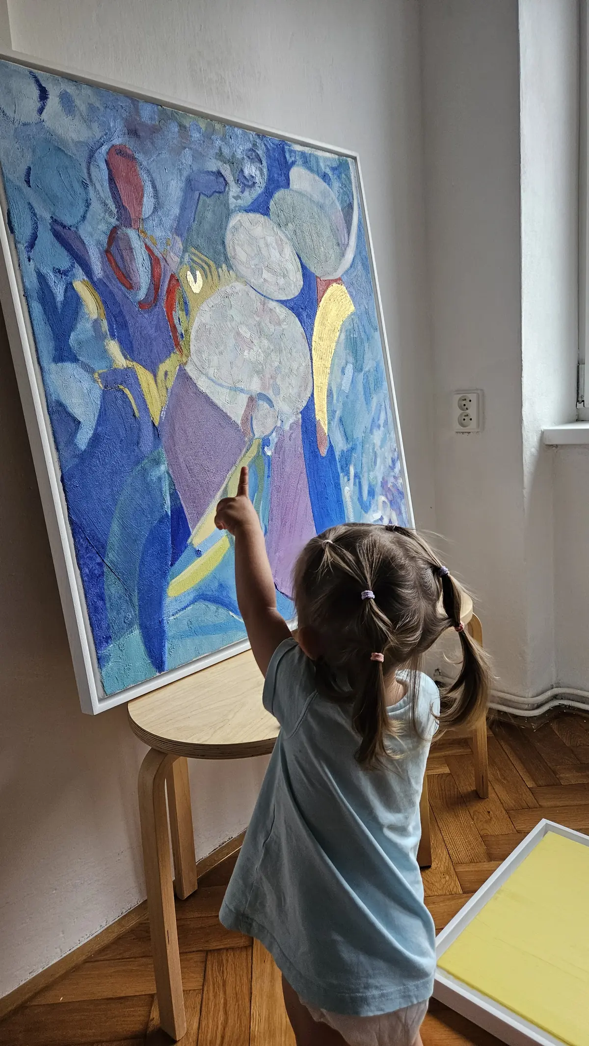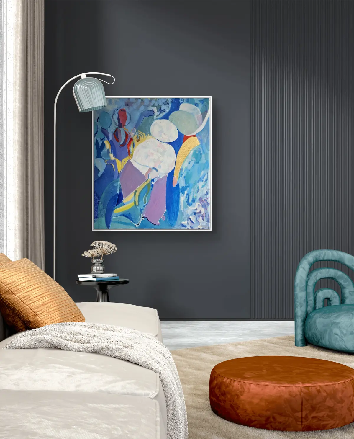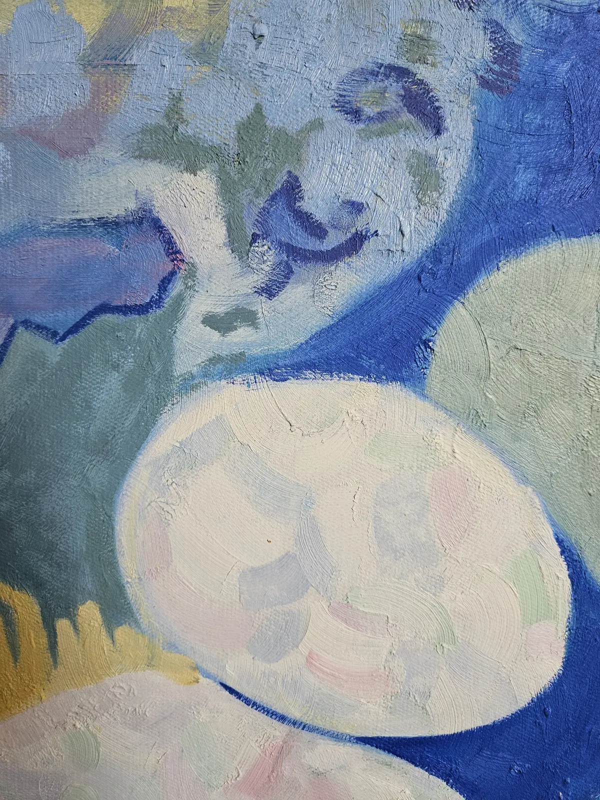 Manželka otevírá téma vztahu muže a ženy – blízkosti, péče i rozdílných potřeb. Postavy se prolínají v jemné modré barevnosti, která vytváří klidnou, téměř intimní atmosféru. Tvar je zjednodušený, siluety jsou měkké, jako by se dotýkaly jen lehce. Je to obraz o rovnováze, kterou ve vztahu hledáme – mezi dáváním a vlastním prostorem.