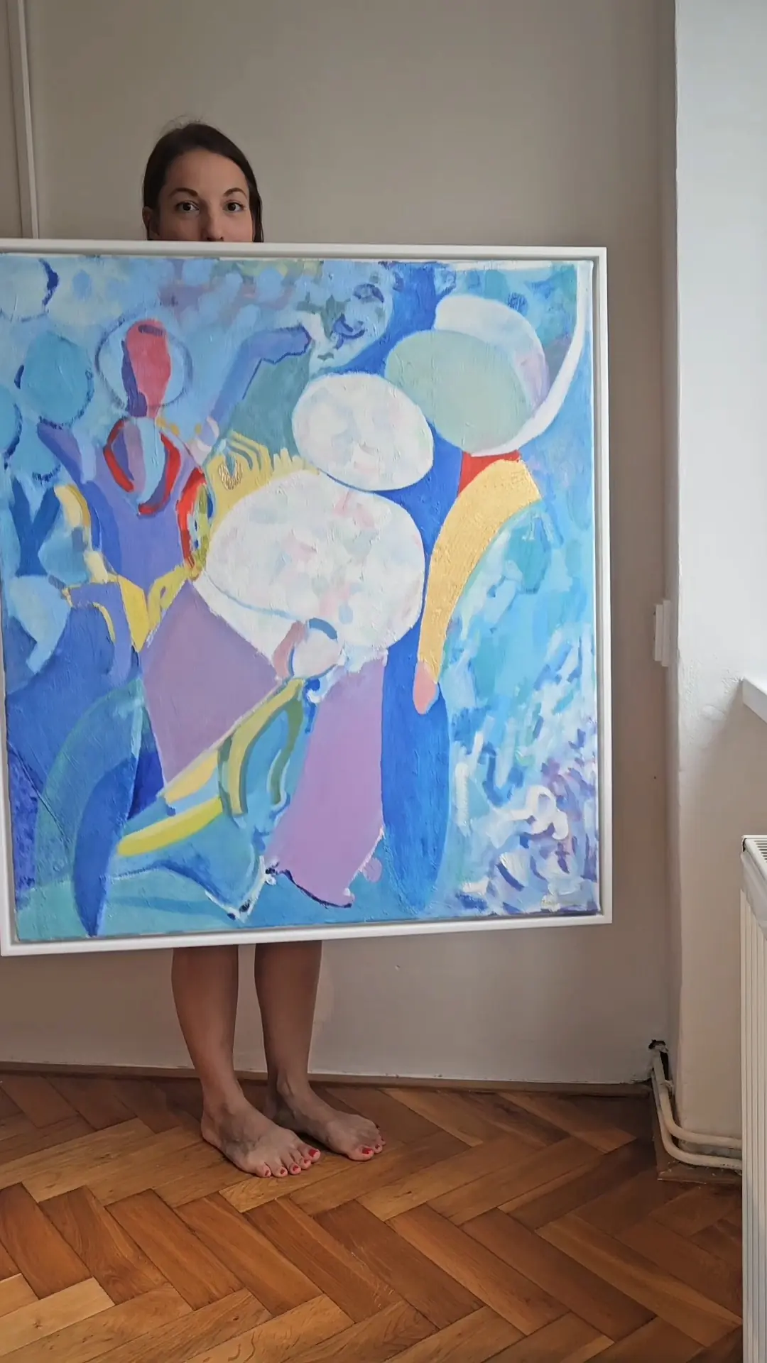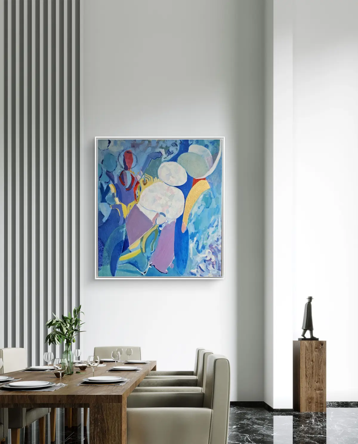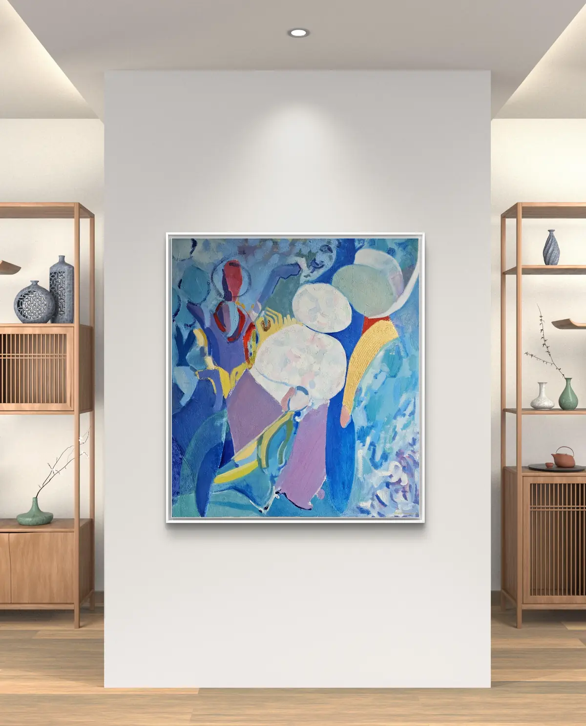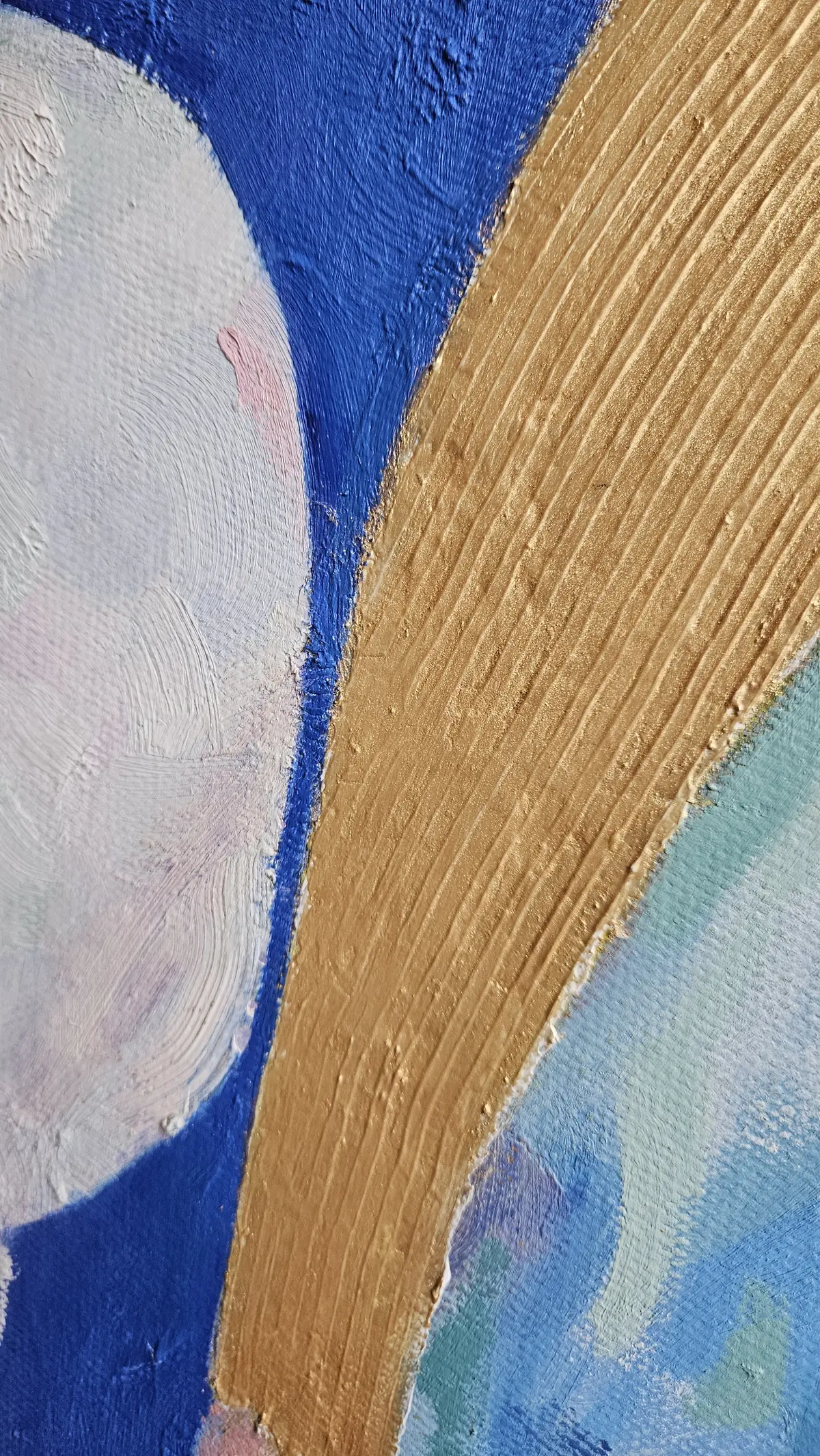 Manželka otevírá téma vztahu muže a ženy – blízkosti, péče i rozdílných potřeb. Postavy se prolínají v jemné modré barevnosti, která vytváří klidnou, téměř intimní atmosféru. Tvar je zjednodušený, siluety jsou měkké, jako by se dotýkaly jen lehce. Je to obraz o rovnováze, kterou ve vztahu hledáme – mezi dáváním a vlastním prostorem.