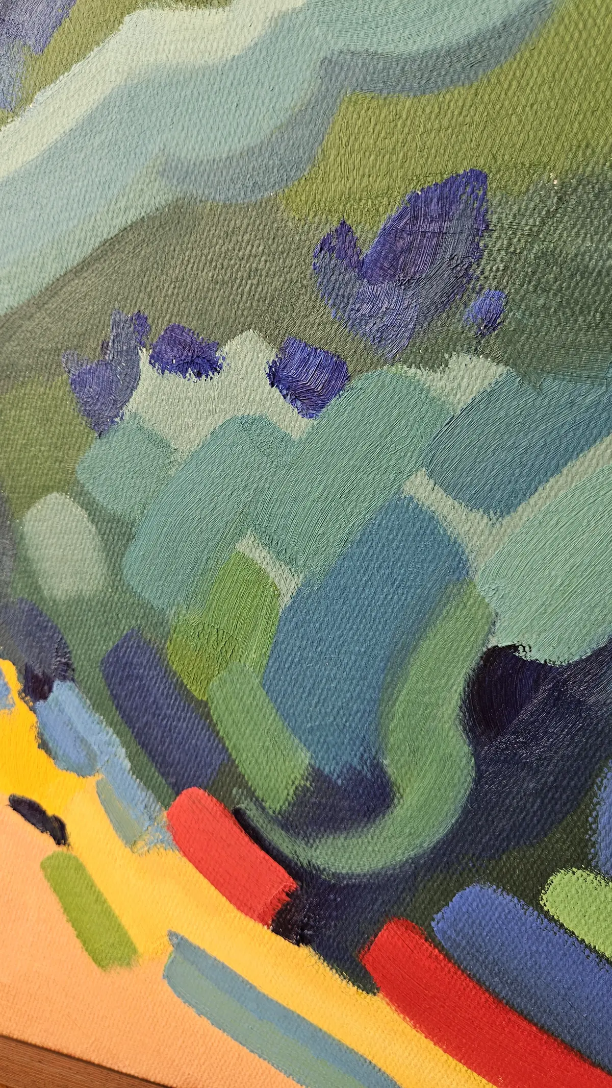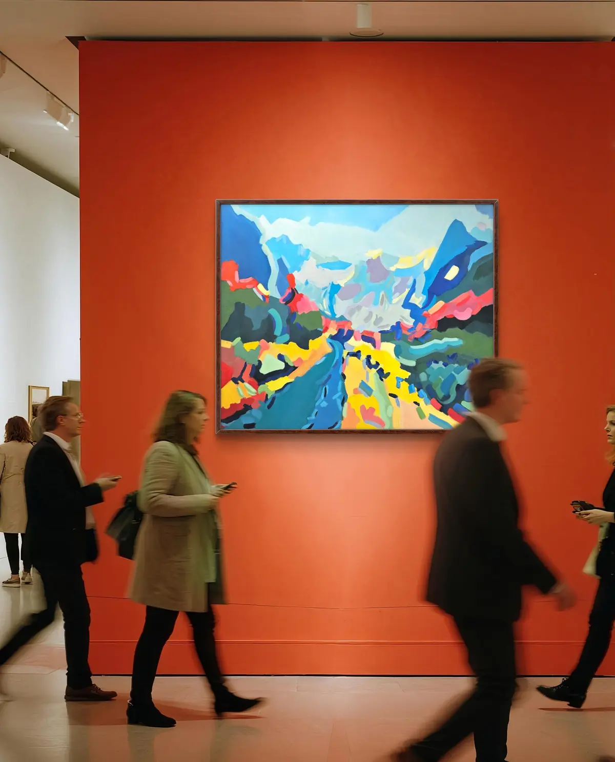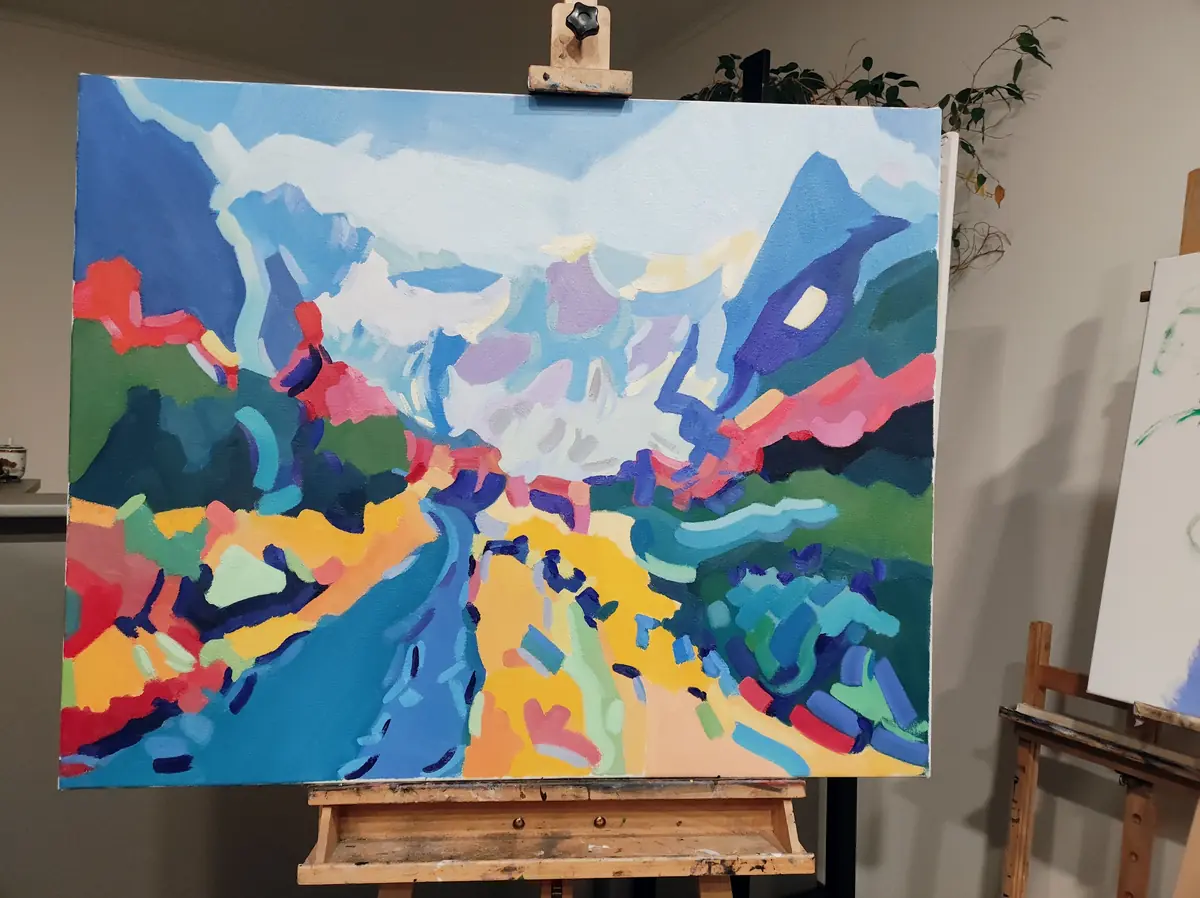 Vysokohorská krajina zde není realistickým záznamem, ale barevným prostorem. Stezka i horizont jsou zjednodušené, barvy posunuté a intenzivní. Obraz pracuje s pocitem otevřenosti a vzduchu. Je to krajina, která dýchá barvou.