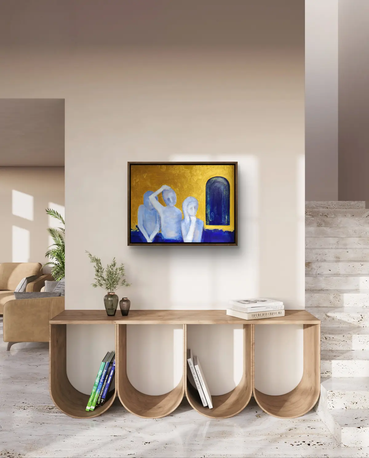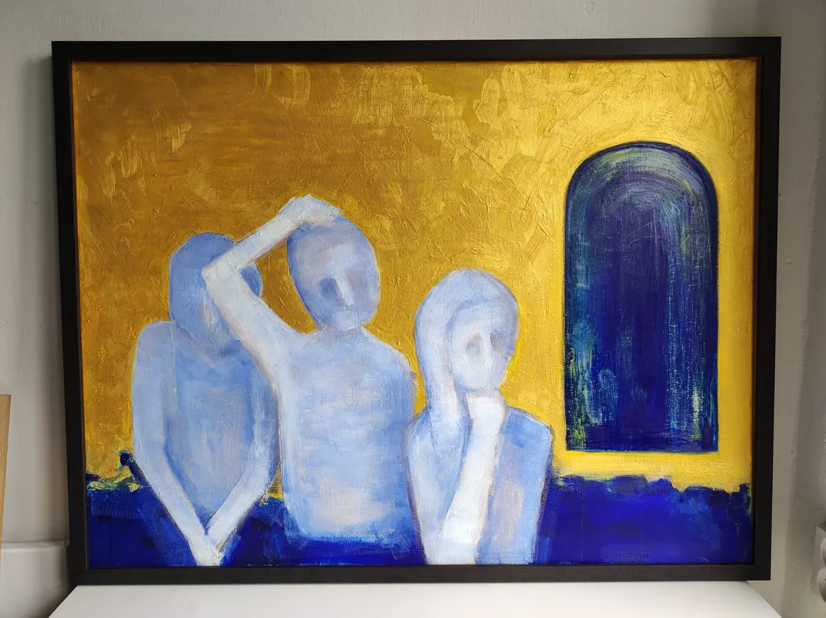 Tři postavy stojí vedle sebe, každá ve svém vlastním světě. Obraz pracuje s kontrastem mezi vnějším dostatkem a vnitřním pocitem prázdna. Barevnost je záměrně zjednodušená. Otevírá téma, zda bohatství a štěstí skutečně kráčejí stejným směrem.