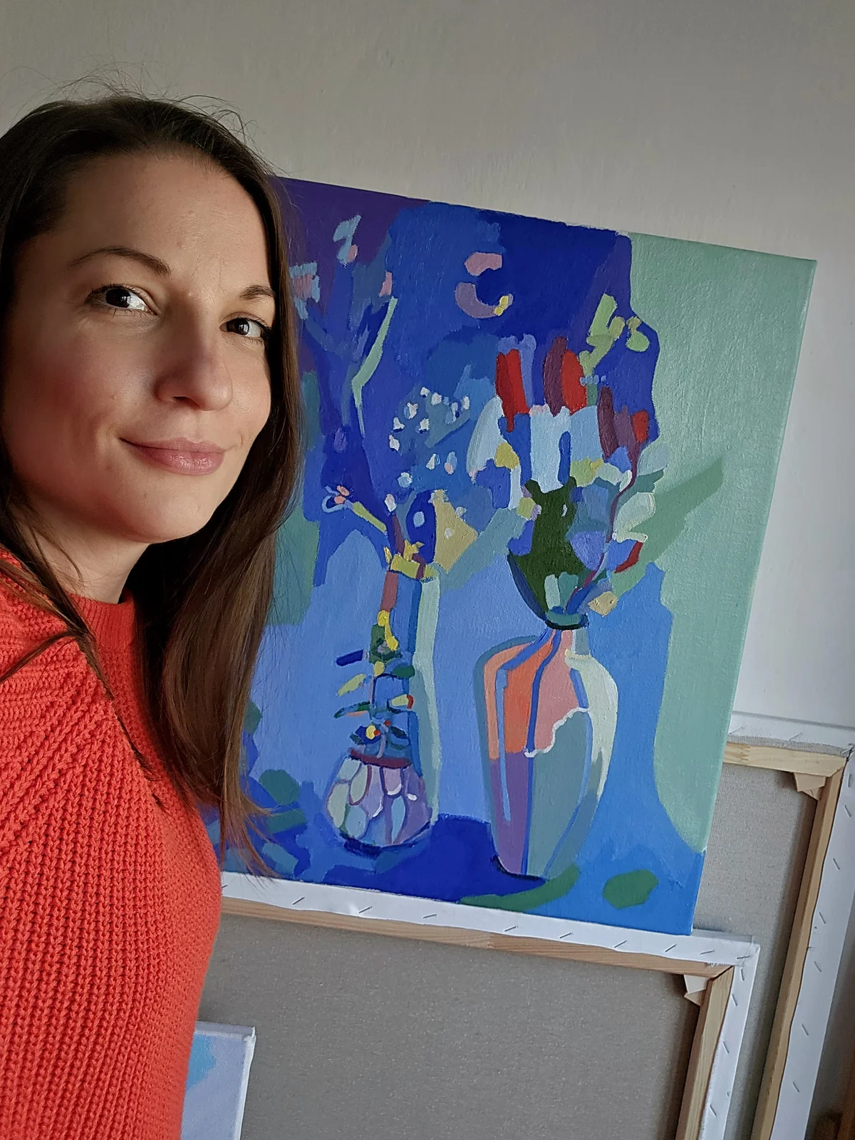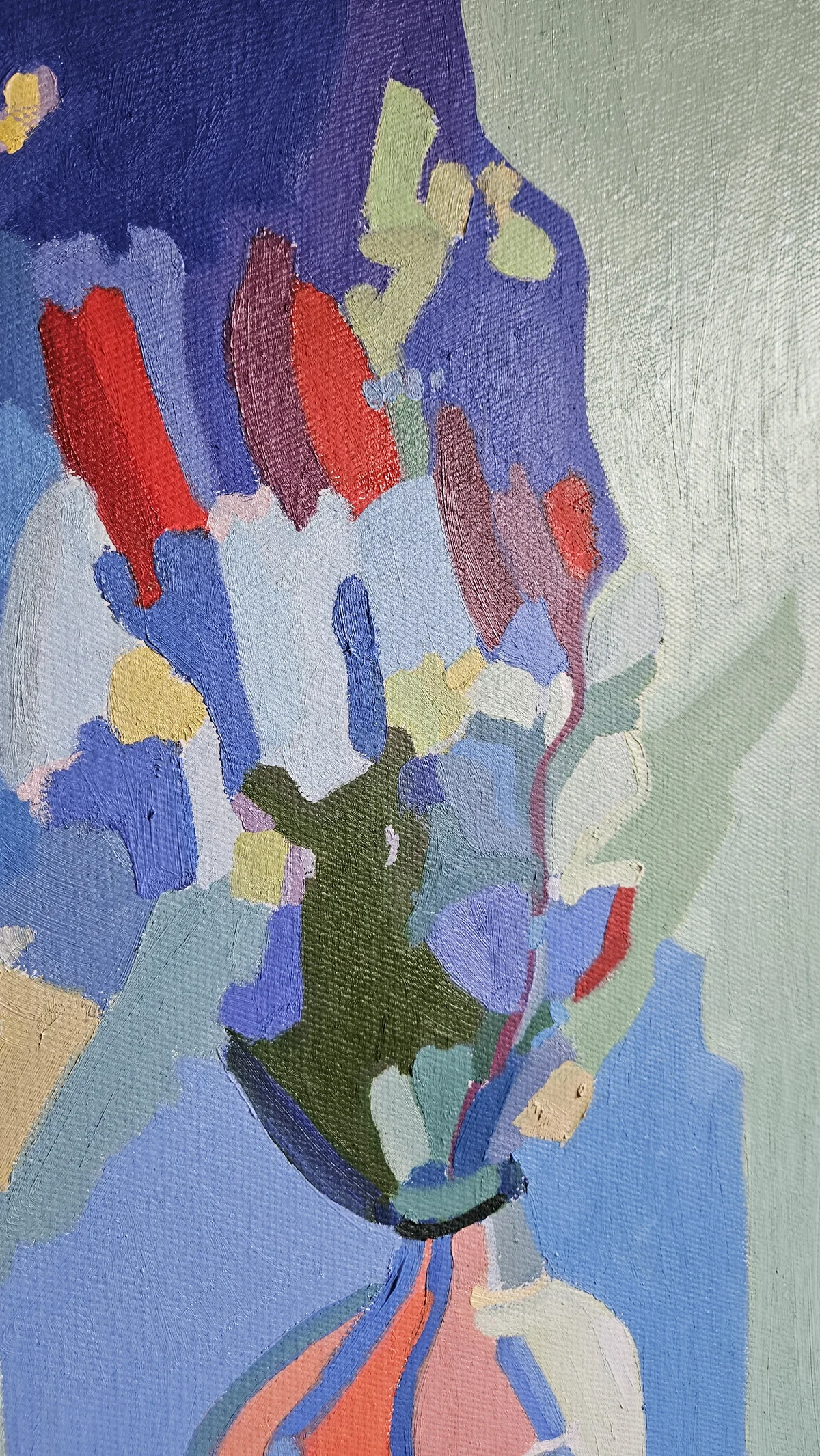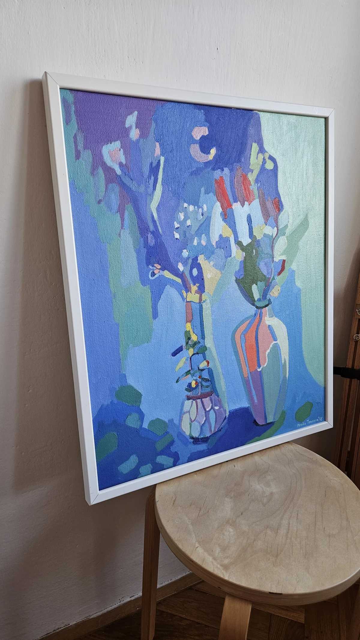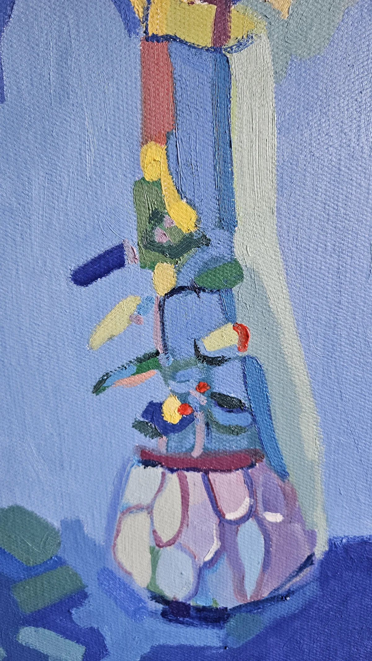 Tmavě modrá kompozice prostoupená jemným zeleným tónem nese tichou, lehce tajemnou atmosféru. Pozornost přitahuje váza, v níž se zachycují odstíny okolí, i drobná tlustice, která navzdory své velikosti vystupuje do popředí. Obraz tak nenápadně připomíná, že i to nejmenší si dokáže říct o své místo.